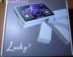 Loupe portable électronique Looky HD Touch, écran 5 pouces haute définition, dimensions 13 x 8 x 5cm, poids 300 g, écran tactile, grossit de 2 à 20 fois, poignée repliable, autonomie 3 heures max, sortie vidéo et HDMI, guide magnétique de lecture, couleurs naturelles ou contrastées 10 possibilités, lignage, gel de l'image, niveau de batterie, réglage de luminosité. Carton d'origine incluant la loupe, la batterie (dans la poignée détachable), sacoche, chiffonnette, cordon s-vidéo, dragonne, chargeur, cordon HDMI, guide magnétique de lecture et documentation en français, ayant très peu servi.