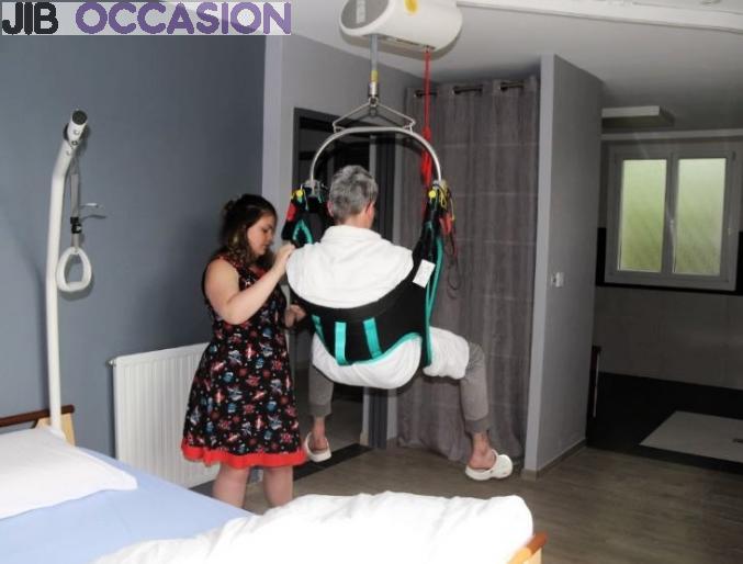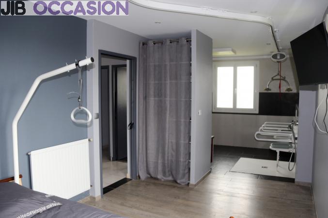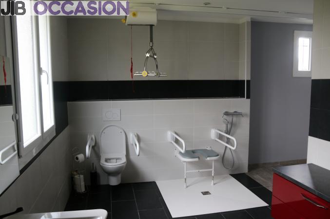 - Une chambre est reliée avec la salle de bain. Un rail de transfert au plafond et un lève-personne motorisé ont été installés pour permettre à la personne à mobilité réduite d’être transférée de son fauteuil jusqu’au lit, à la douche à l’italienne et aux toilettes (siège de douche)